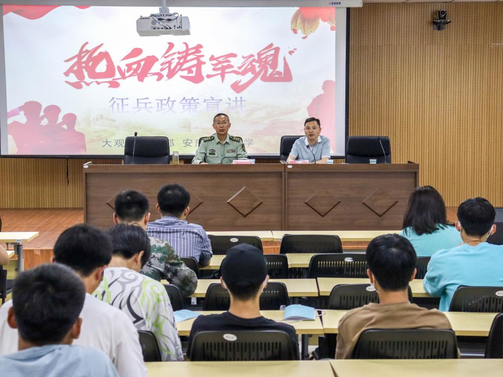 5月24日,威尼斯官网举行2022年大学生秋季征兵政策宣讲会。威尼斯官网邀请大观区人民武装部部长陈洪涛作题为“热血铸军魂”的主题政策宣讲。宣讲会由学生处副处长夏斐主持。各学院征兵工作专管教师和100余名有意愿参军入伍学生代表参加宣讲会。