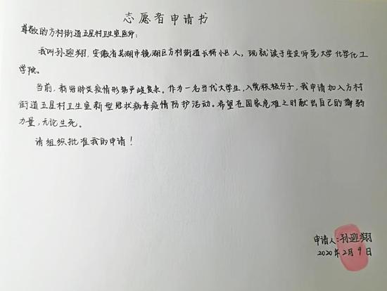 “作为一名入党积极分子和学校第十一期青马班一班班长,我更有责任和义务为疫情防控工作贡献自己的一份微薄之力。”孙迎翔坚定地说,志愿工作虽然辛苦,但是居民们的支持和理解让她觉得一切都是值得的。孙迎翔递交的抗疫志愿服务申请书中有这样一句话:“希望在国家危难之时献出自己的薄弱力量,无论生死。”她说:“我们培训班的同学常常称自己为‘爱马士’,指用马克思主义思想武装头脑的青年人。这份申请书也是我作为一名坚定的‘爱马士’志愿参加抗疫服务工作的决心。”