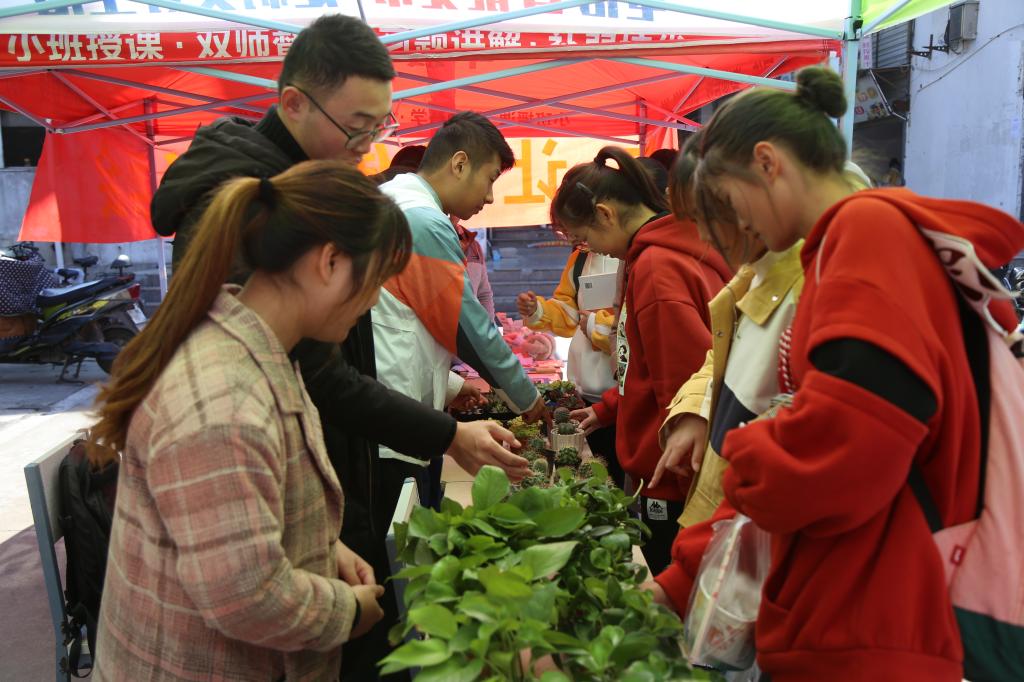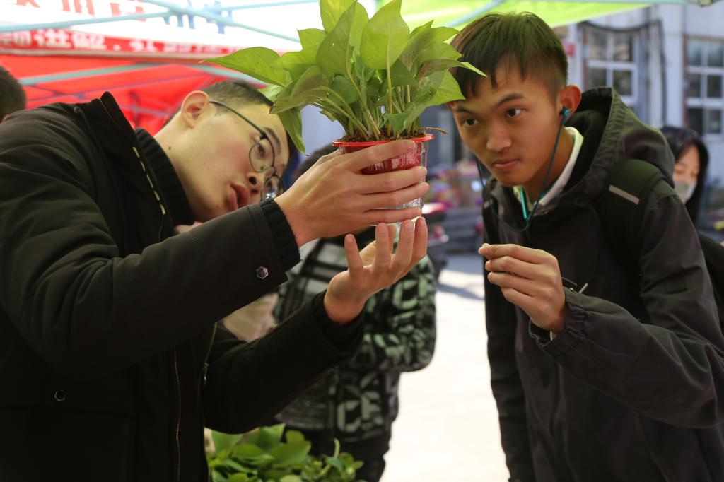 除了日常生活用品,义卖第三天新进的绿植小盆栽吸引了许多学生的目光。“这个是什么植物?”、“多肉多少钱一盆?”、“绿萝好养吗?”……伴随着密集的询问声,很快就售出了十几盆绿植,可谓是十分畅销。“绿萝,多肉和黄金草我各买了一盆,本来我就很喜欢花草,刚才听工作人员说卖完的钱是要捐给同学的,觉得挺有意义的,就想着多买一点。”数字媒体技术专业2018(1)班的薛建宇表示,绿色代表希望,自己也希望这位同学的情况能早点好起来。