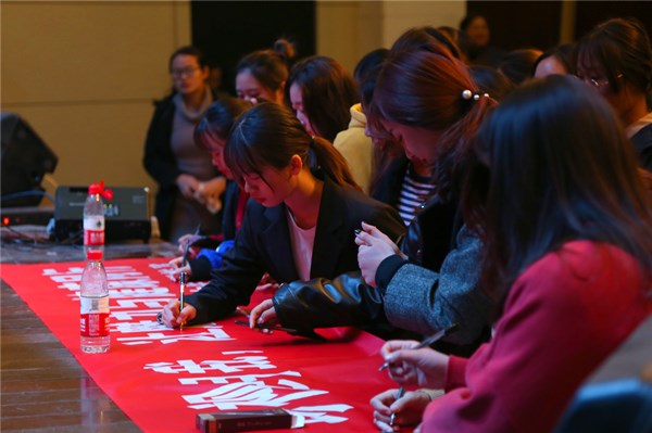 首先,女生代表王慧娟宣读了敬敷女生工作坊向全校女生发出的健康倡议书,号召广大女生进行科学的性别认知与接纳,树立科学的健康观念,培养爱的能力,做自尊自爱自信自强的新时代女性,现场女生依次在“珍视自我,让魅力与健康同行”的宣传横幅上郑重签名。