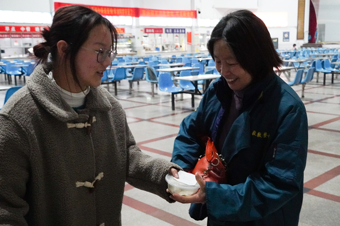 “水饺店”不仅面向学生营业,也为食堂中工作的职工们送去冬日的温暖。在结束一天近17个小时的工作后,负责后勤杂务的顾小芳收到了这份独特的“礼物”。“阿姨您辛苦了!谢谢您一直以来的付出!”中心成员之一汉语言文学专业2020(4)班的宫尚亮将24个水饺被整整齐齐地码在盒中,打包好送到她的手里。“我们想为这些叔叔阿姨送上水饺,表达我们的感谢。”宫尚亮说。