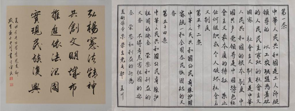 学生党员们通过硬笔书法或软笔书法,采用隶书体、行书体、楷书体三种书体形式将“中华人民共和国是工人阶级领导的、以工农联盟为基础的人民民主专政的社会主义国家”、“中华人民共和国的一切权力属于人民”、“中华人民共和国公民在行使自由和权利的时候,不得损害国家的、社会的、集体的利益和其他公民的合法的自由和权利”等宪法内容和条款落在纸上。本次党日活动共收集书法作品40余份,其中优质书法作品已在美术学院展厅展出。