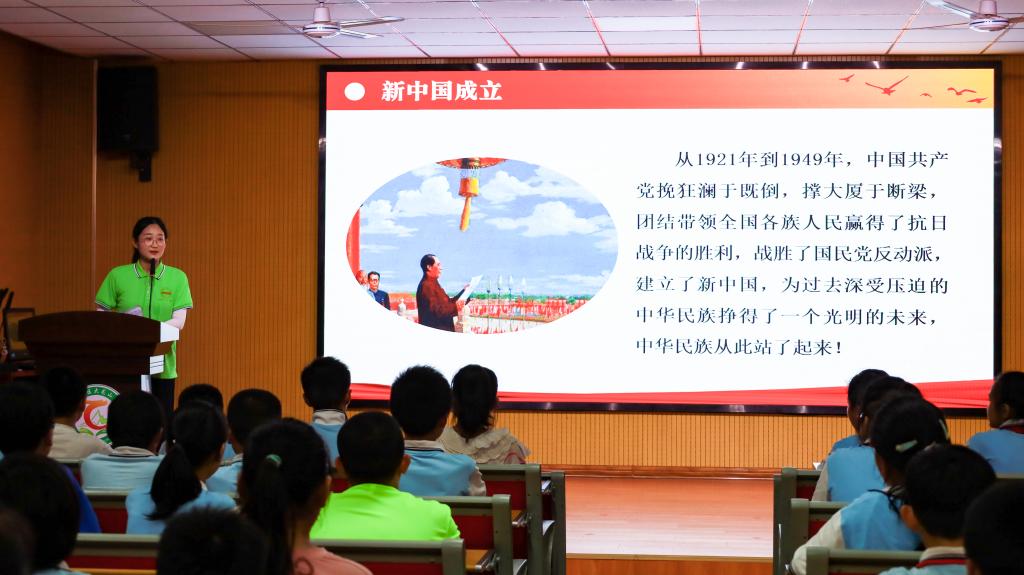 “共产党就是自己有一条被子,也要剪下半条被子给老百姓的人。”在安庆市大龙山中心小学、安庆市依泽小学,团队成员、思想政治教育专业2021(1)班的张雅雯正为台下的“红领巾”们讲述着共产党员的初心故事,用一个个“铁心跟党走”的动人故事,为孩子们解读百年党史的“四个伟大成就”。