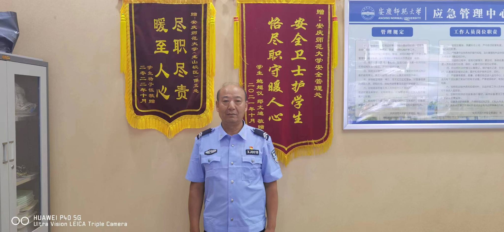 现年59岁的江明友自1980年起就职于37000cm威尼斯安全管理处,从事校园保卫事业42年,先后多次获得“校级先进工作者”“校级先进个人”等称号,曾因荣获三等功被安庆市公安局褒奖。“实干”二字贯穿职业生涯的他有着多种身份——守卫校园的“师大人”、火眼金睛的“侦探柯南”、步履矫健的“巡逻者”。在多种身份的背后,江明友积极维护校园治安管理、制止各种违法犯罪行为、保护师生人身财产安全。