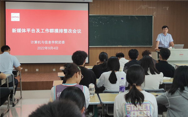 9月4日,计算机与信息学院于L314教室召开了学生新媒体平台及工作群组排查整改会议,进一步加强新媒体平台建设和网络安全监管。院党委副书记刘燕杰、团委负责教师、部分辅导员、各学生组织负责人、各班级班委共130余人参加会议。