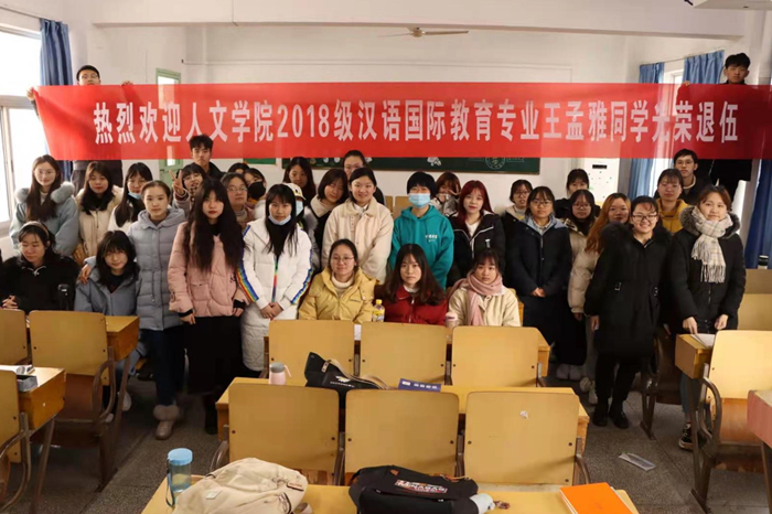 “热烈欢迎人文学院2018级汉语国际教育专业王梦雅同学光荣退伍!”在菱湖校区教学楼310教室,汉语国际教育专业2018级的学生们举办了一场特殊的欢迎会,欢迎刚从南海舰队退伍的王梦雅同学。