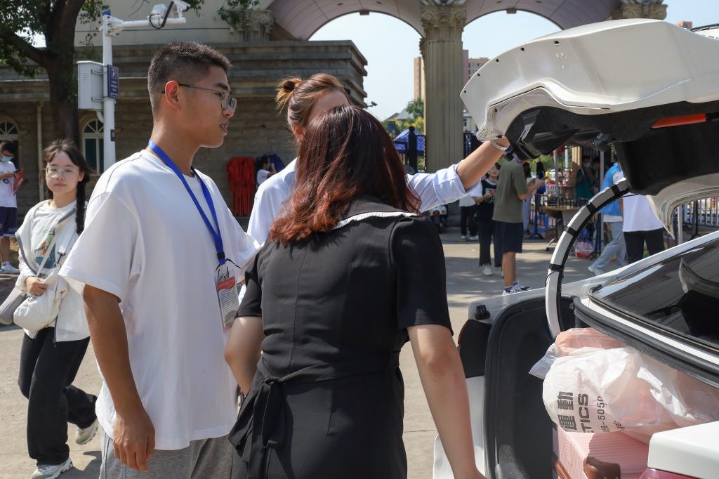 上午9点40分,由于学校东门的车辆过于拥挤、难以通行,原本在东门口等候多时的姚强诚、汪悦和两位学生志愿者提议让方芳的家人将车辆开至南门口,随即四人前往南门等待方芳的到来。“前期筹划时,我们已经了解了方芳报到的时间、交通方式以及所带行李数量,最终决定在校内开车去接她。”姚强诚笑称今天自己只是“司机”,负责全程接送方芳。