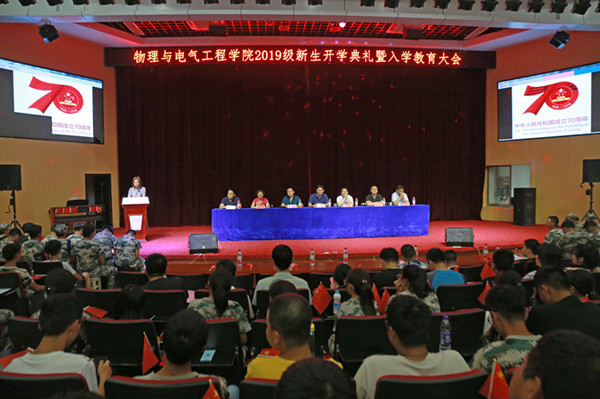 9月18日下午,物理与电气工程学院在龙山校区图书馆东厅举行2019级新生开学典礼暨入学教育大会。学院党委书记江贵生,副院长董甲东、江善和,党政班子成员,学院各专业负责老师,教师代表,新生辅导员及2019级全体新生参加典礼。典礼由江善和主持。