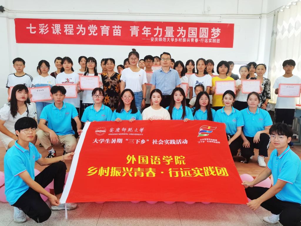 实践团走进望江县新坝中学,围绕“七彩课程为党育苗,青年力量为国圆梦”主题,将七彩课堂与党史学习教育相结合,通过日常教学、艺术活动等形式,为学生带来一场别开生面的艺术课堂,将红色基因植根于乡村中学学生心田。