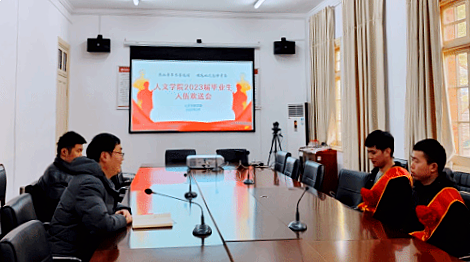 近日,2023届毕业生入伍欢送会在红楼会议室举行,人文学院党委副书记王波主持欢送会。2023届两位毕业生王宇、洪祥身披“光荣入伍”绶带、胸前佩戴大红花参会。