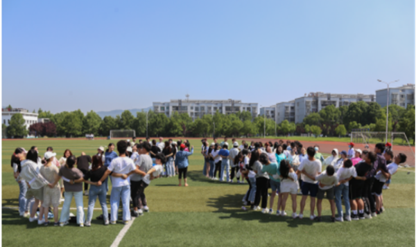 活动分为开场热身、破冰游戏、团队竞赛与总结分享四个环节。首先通过“逆时针慢跑”进行热身,随后利用“报数搭伙”和“大树与松鼠”两个破冰游戏让同学们放松心态,增强互动。然后便进入到团队竞赛“绝地求生”环节,全体心理委员十人一组,确定队名和口号,同时站在一张报纸上,并将报纸不断对折,使用报纸面积最少的队伍获胜。最后在总结分享中,各位同学纷纷发表此次活动中的收获与成长。