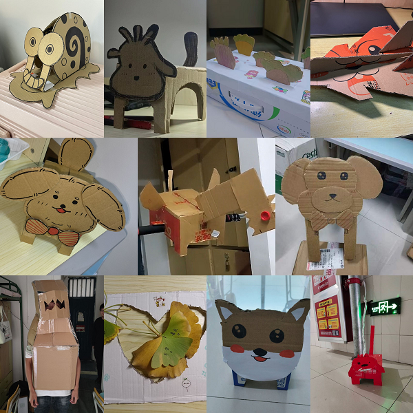 除了记录路人网购开箱,利用废旧纸箱进行DIY创意大赛也是本次活动一大特色。将简易的材料做到生动的呈现,考验着学生们的创造力和动手能力。学生们需要对收集的快递盒进行简单处理和DIY彩绘,设计出各种小动物、卡通人物形象。参与创作的陈子龙同学说:“这让我在体验到动手制作的快乐同时,更认识到绿色环保的重要性。”