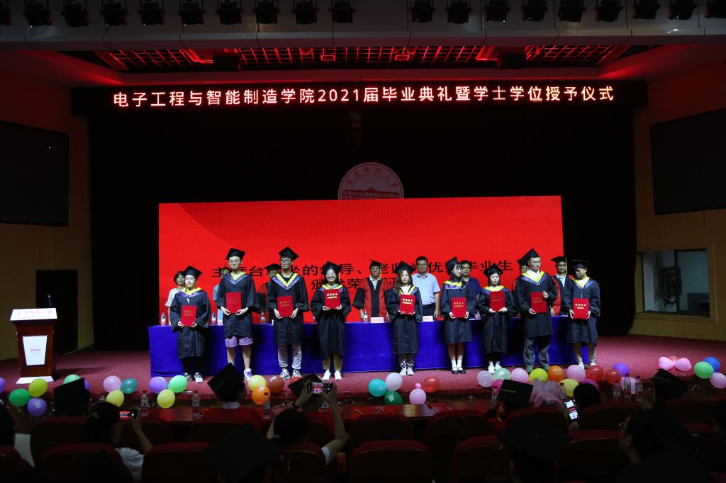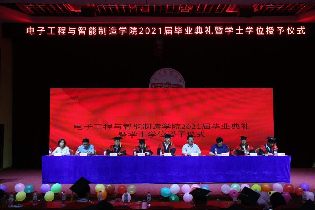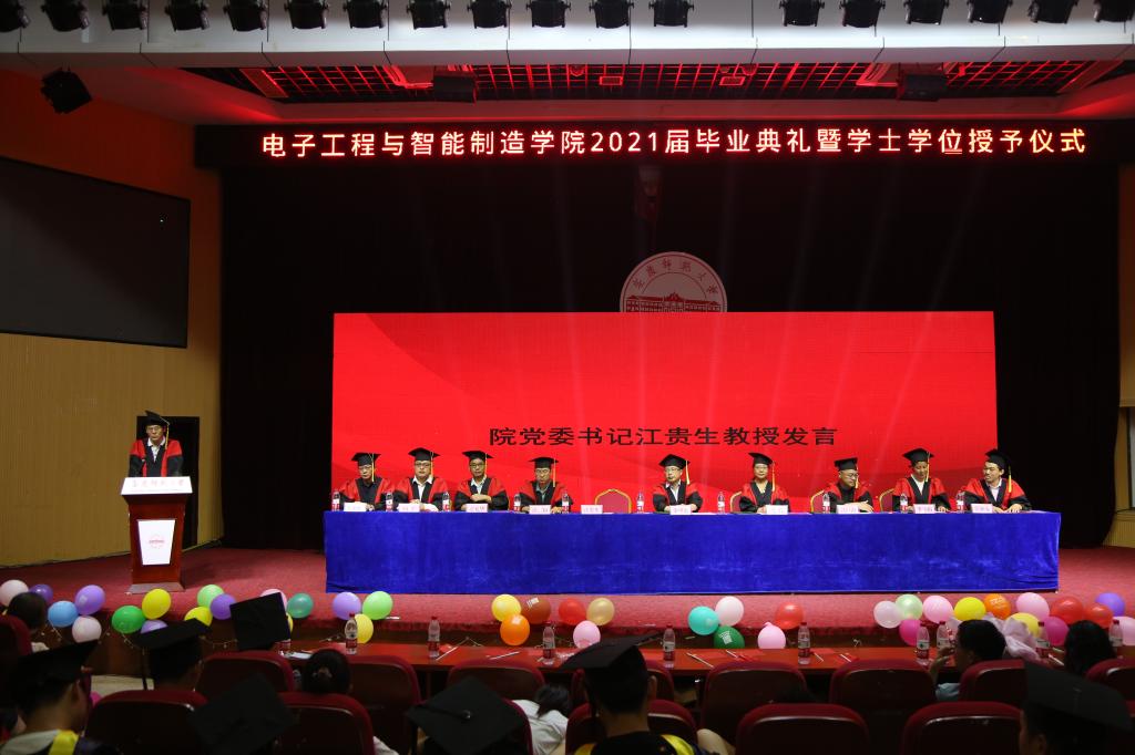 盛夏将至,毕业如期。6月29日下午,电子工程与智能制造学院2021届学生毕业典礼暨学位授予仪式在图书馆东报告厅隆重举行。学院领导班子成员、系主任、教授代表、校友代表、毕业班学生家长代表、毕业班辅导员和2021届毕业生代表参加典礼,毕业典礼由院党委副书记关德军主持。
