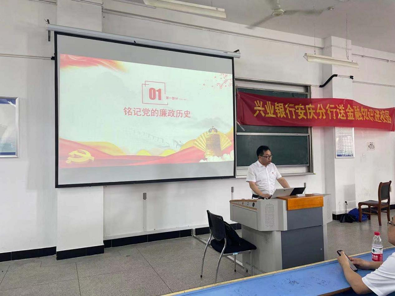 为进一步做好党史学习教育,以实际行动践行“学党史办实事”的要求,积极拓展课堂思政,构建三全育人思政大格局,6月9日,经济与管理学院邀请来自兴业银行股份有限公司安庆分行、中国人寿安庆分公司的专家团队,举办“清廉金融文化进校园”主题讲座。兴业银行股份有限公司安庆分行副行长赵吴锋、中国人寿安庆分公司纪委书记张波带队出席讲座。经济与管理学院党委副书记周毅,学院部分学生党员和入党积极分子参加讲座。讲座由学院物流学生党支部书记孙芮主持。