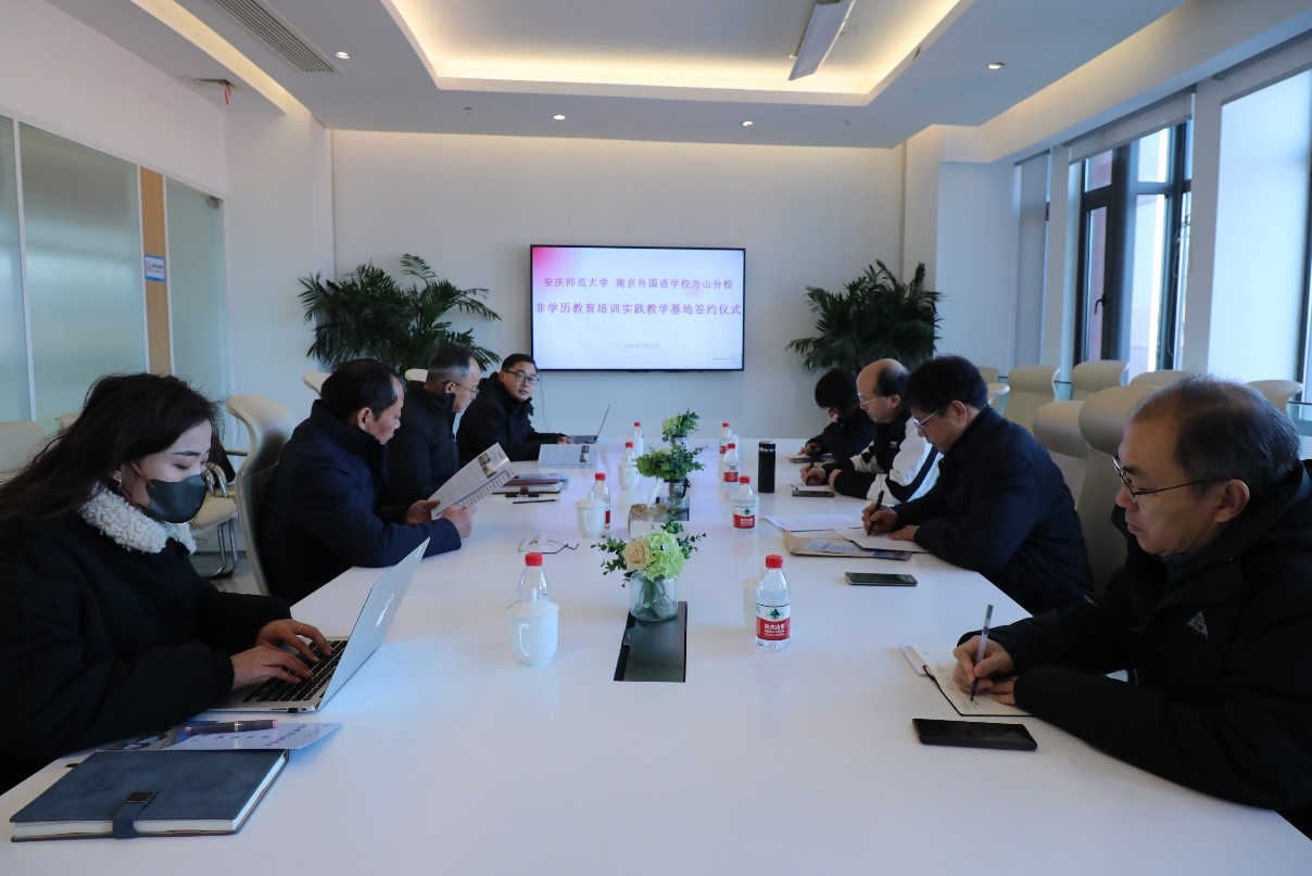 李俊详细介绍了南京方山外国语学校的办学优势、师资队伍、办学特色等方面情况。双方代表在与会人员的见证下签署了合作共建非学历教育实践教学基地协议。