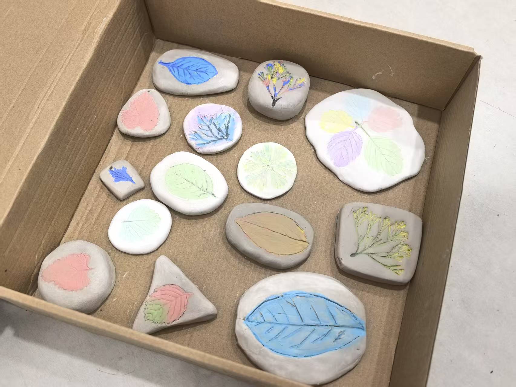 活动伊始,美术学院陶艺俱乐部负责人、美术学专业2023(4)班路子俊同学系统讲解了陶艺制作流程,现场还示范了揉泥、塑形、拓印等技法。参与者以2—3人为小组进行协作,从泥板塑形到釉彩绘制全程自主创作。“我们鼓励同学们以自然元素为灵感,通过叶片拓印、肌理刻画等方式,将传统技艺转化为个性化表达。”路子俊表示。