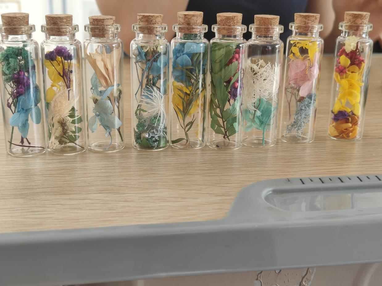 手执玻璃细挑选、编织干花释压力、分享心事互倾听……工作人员引导学生使用干花在玻璃瓶里进行创作,同学们充分展示自己的创作,表达内心想法。工商管理类专业2024级(2)班的郭笑彤同学表示,“在挑选自己心仪的干花和思考如何创作中,让我在释放情绪压力的同时体验到了感受到创作的魅力。”财务管理专业2023级(1)班的李嘉怡同学在完成创作后兴奋地说道:“通过这次活动,我不仅缓解了压力,还结识了一群志同道合的朋友。”