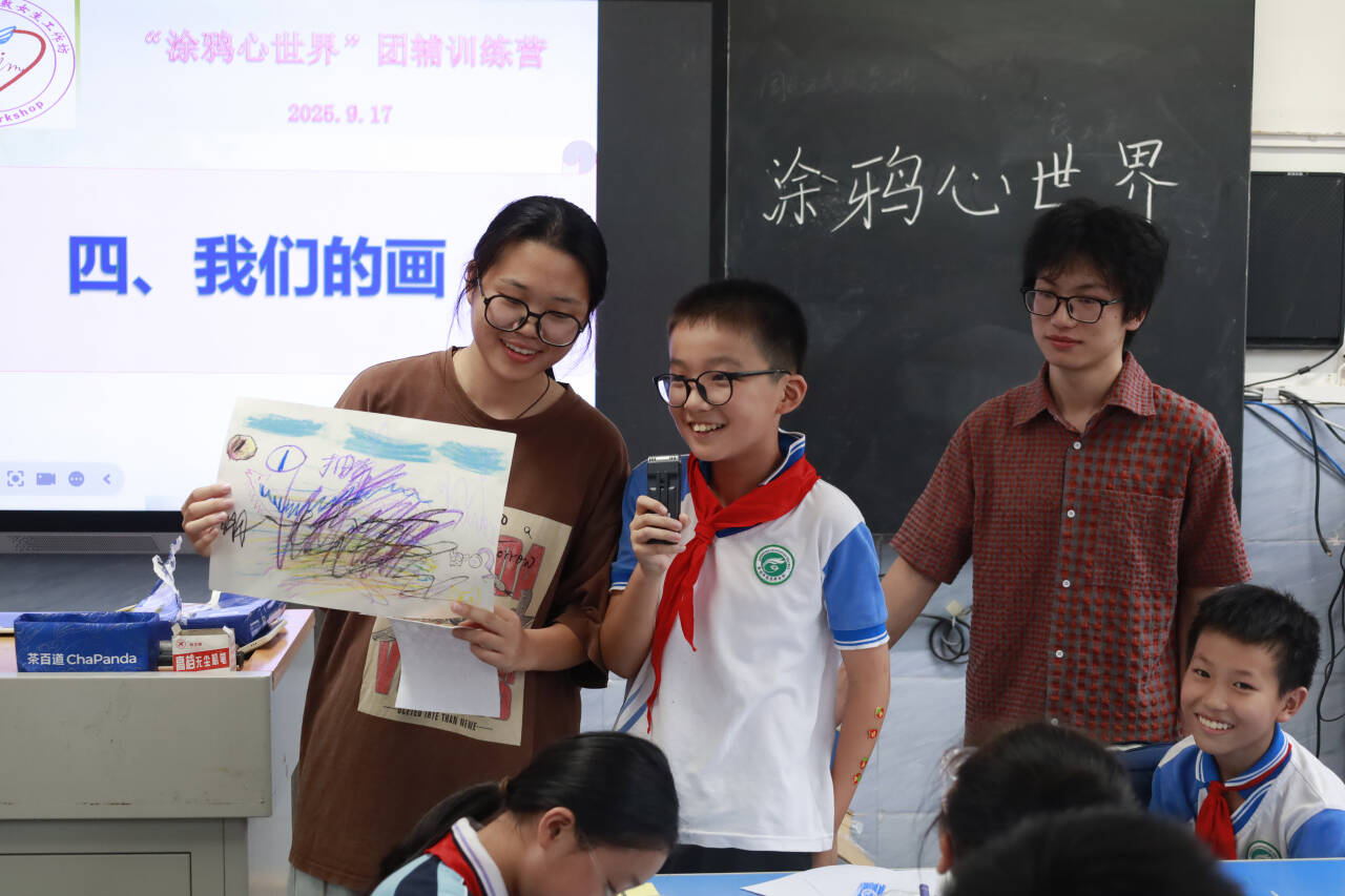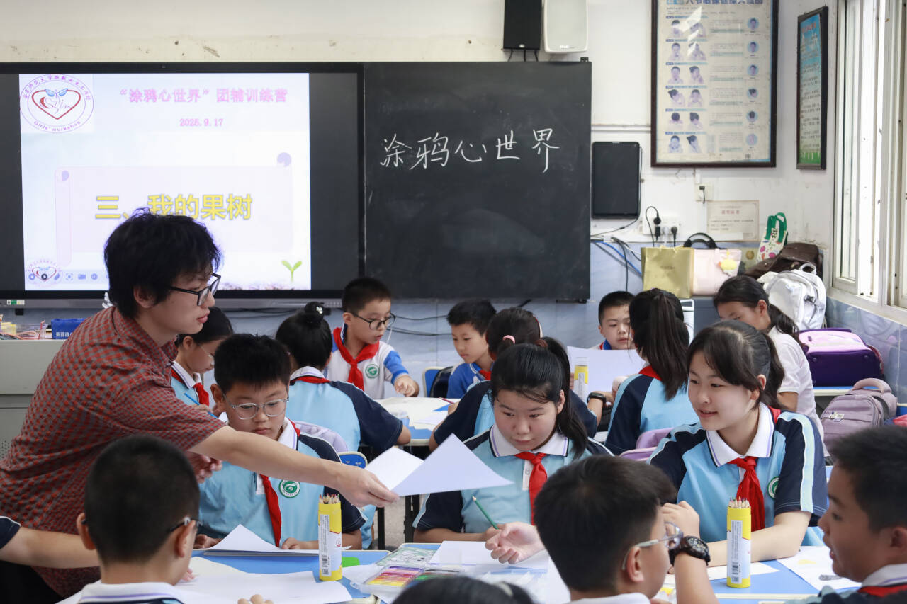 在“我的果树”环节,团辅活动负责人2023应用心理学专业的朱同学引导小朋友们充分发挥想象力,大家不仅描绘出自己心中理想的“果树”,还添加了诸多其他元素,有的小朋友使“果树”结满彩色果实,枝头停着小鸟;有的则在“果树”旁点缀上各种自己喜欢的事物,鼓励小朋友们在画纸上写下自己对未来的期许。六年级(2)班的唐同学自己画的果树旁写下“听党话,跟党走,努力为中华民族而努力”的内容,她表示,这样书写是因为这是每个中国人应当践行的准则。