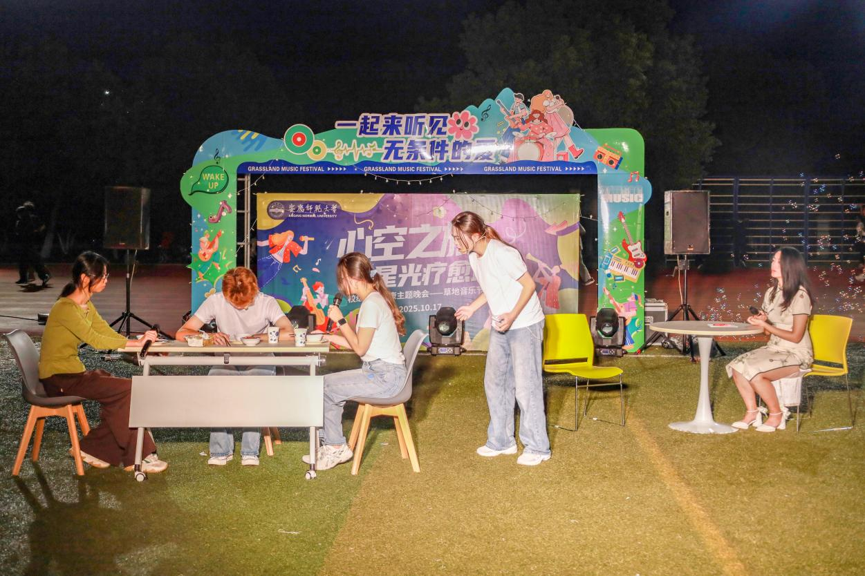 渐变蓝的“心空之旅·星光疗愈站”背景板晕着柔光,音乐元素与霓虹标语点亮绿色草坪。说唱《Step2》以极具爆发力的节奏拉开晚会序幕,点燃全场热情;歌曲《空耳》借柔婉音律轻抚心湖,默默疗愈心灵褶皱;舞蹈《我的未来式》带着跃动节拍登场,将活力洒满现场……随机派发的小糖果、互动环节的惊喜礼盒、学生们手中挥舞的荧光棒,让这场草坪上的“心空之旅”充满治愈与欢喜。