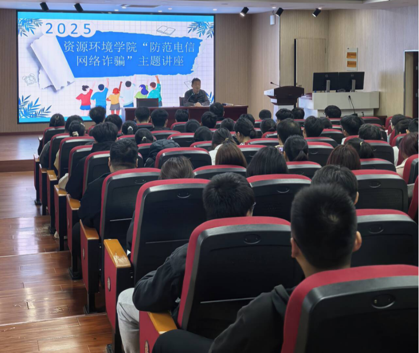 10月21日,资源环境学院在F411报告厅举办了“防范电信网络诈骗”专题讲座。讲座由学院党委副书记黄建平主持,2025级地理科学专业、资源环境大数据工程专业全体学生及研究生参加。