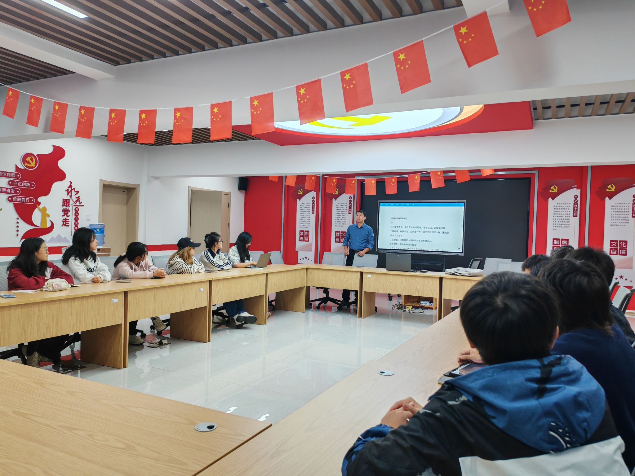 活动中,肖之进向大家介绍,“红芯e家”党支部作为扎根学生公寓的功能性党支部,始终致力于搭建学院党委与学生的连心桥,此次专题辅导正是支部发挥阵地优势、服务学生成长的具体实践。他希望同学们以发展对象为新起点,始终以党员标准严格要求自己,坚定理想信念,永葆初心使命,在校园生活的各个方面展现新时代青年的担当与风采。肖之进勉励大家要持续发挥模范带头作用,在学习科研中勇攀高峰,在志愿服务中积极主动,尤其要积极参与“红芯e家”党支部组织的社区服务、理论学习等活动,在实践中锤炼品格;在日常言行中严于律己,以实际行动影响和带动身边同学,共同营造积极向上的社区氛围与校园风气。最后,围绕党建材料的完善开展集中交流指导。肖之进结合以往审核发展对象党建材料时发现的共性问题,进行了细致梳理与深入分析,并针对这些问题,逐一开展业务指导。