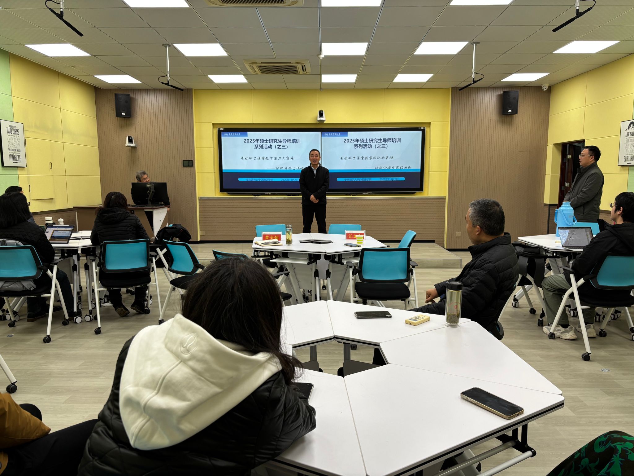 熊捍东结合自身几十年的教学实践,围绕智慧教学平台的深度应用、研究生培养方案解读、研究生课程组织、实施与评价,以及课堂管理等方面内容,与在场教师分享经验。作为校级教学督导,他特别强调“讲台意识”的重要性,呼吁导师们以“终身学习”的态度持续打磨教学技能,在教学设计中兼顾知识传授与思维训练,真正实现从“教知识”向“育能力”的转变。整场讲座案例鲜活、语言风趣,既有方法论指导,又有实践示范,为在场师生呈现了一堂高质量的“教学示范课”。