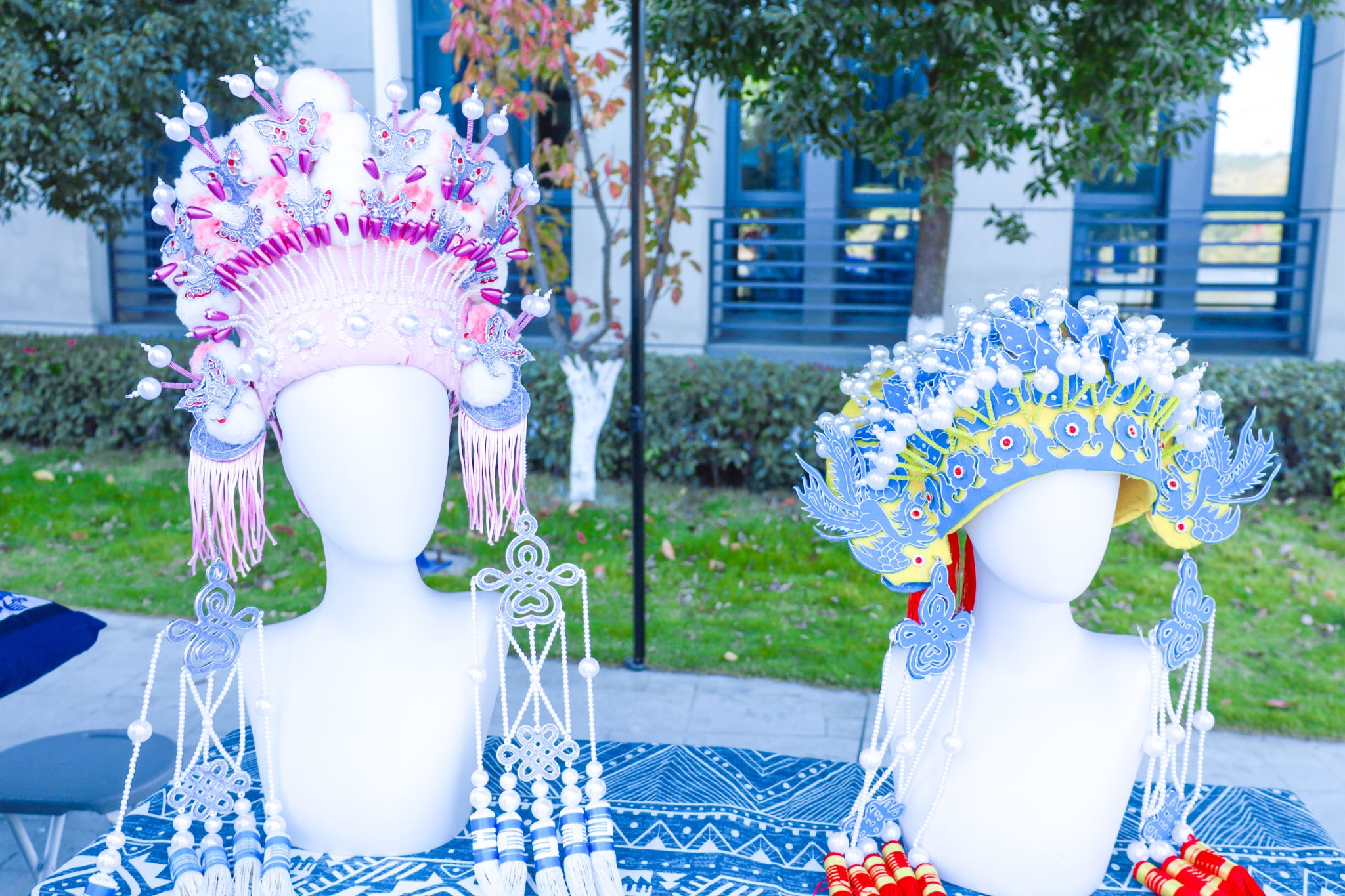 走进展区,美美“薪”传美育工作室的手工盔帽率先抓人眼球,银线云纹缠绕帽檐,仿点翠饰片流光溢彩;六尺巷主题文创套装里的典故插画鼠标垫、徽派建筑钥匙扣同样吸睛,让非遗以趣味形式贴近青年。“我们想让非遗走出课本,让年轻人感受传统工艺魅力。”团队成员介绍,现场不仅有完整盔帽展品,师范生特制的拆分部件可作京剧文化教学教具,脸谱作品也紧扣美术课程面具制作内容,实现非遗传承与师范教育的有机融合。