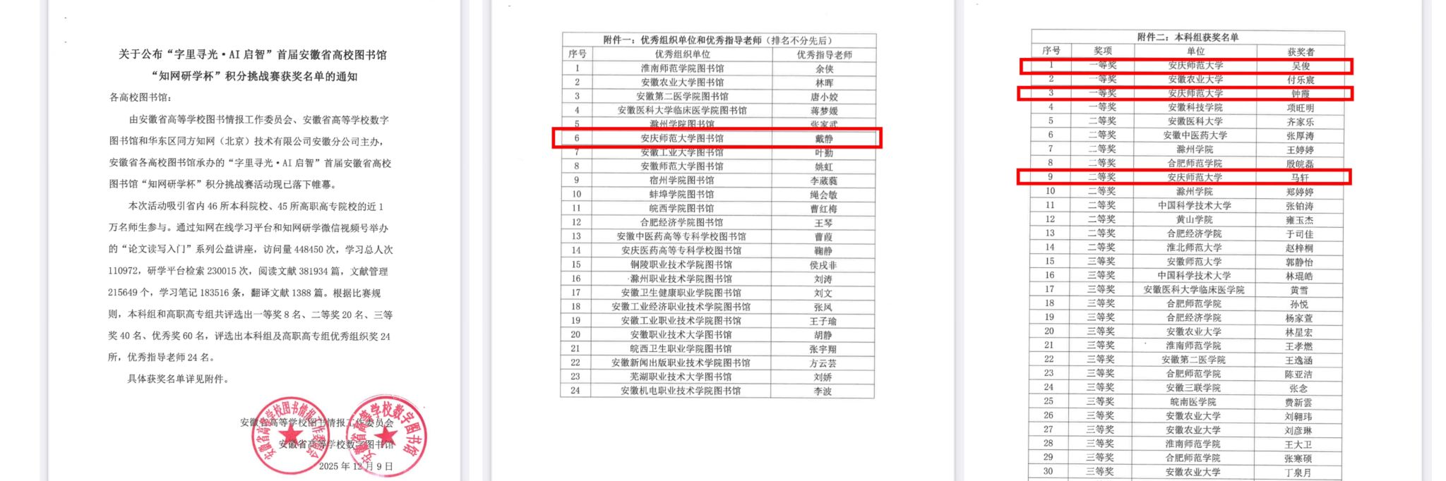 近日,“字里寻光·AI启智”首届安徽省高校图书馆“知网研学杯”积分挑战赛圆满落幕。本次大赛中,法学院吴俊、钟霞同学获一等奖,教育科学学院马轩同学获二等奖,在此次比赛中威尼斯官网参赛人数和获奖成绩在全省各院校中均居前列,图书馆获得“优秀组织单位”奖。