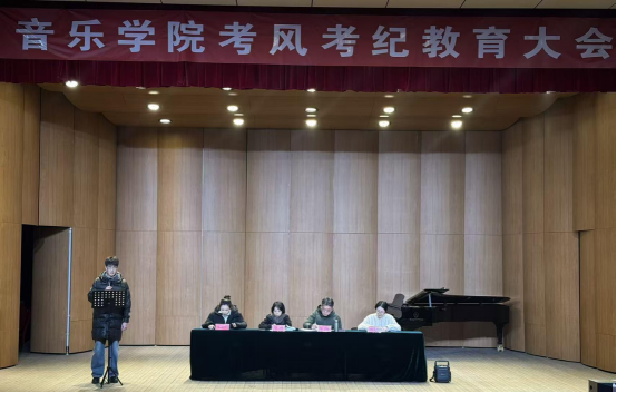 12月24日,音乐学院在音乐厅召开2025—2026学年第一学期考风考纪教育大会,旨在强化师生纪律意识,营造公平公正的考试环境。音乐学院党委书记张铭、党委副书记贾涛、教务秘书熊星子、教师代表张源宁出席会议,学院大一至大三全体学生及辅导员参加会议。