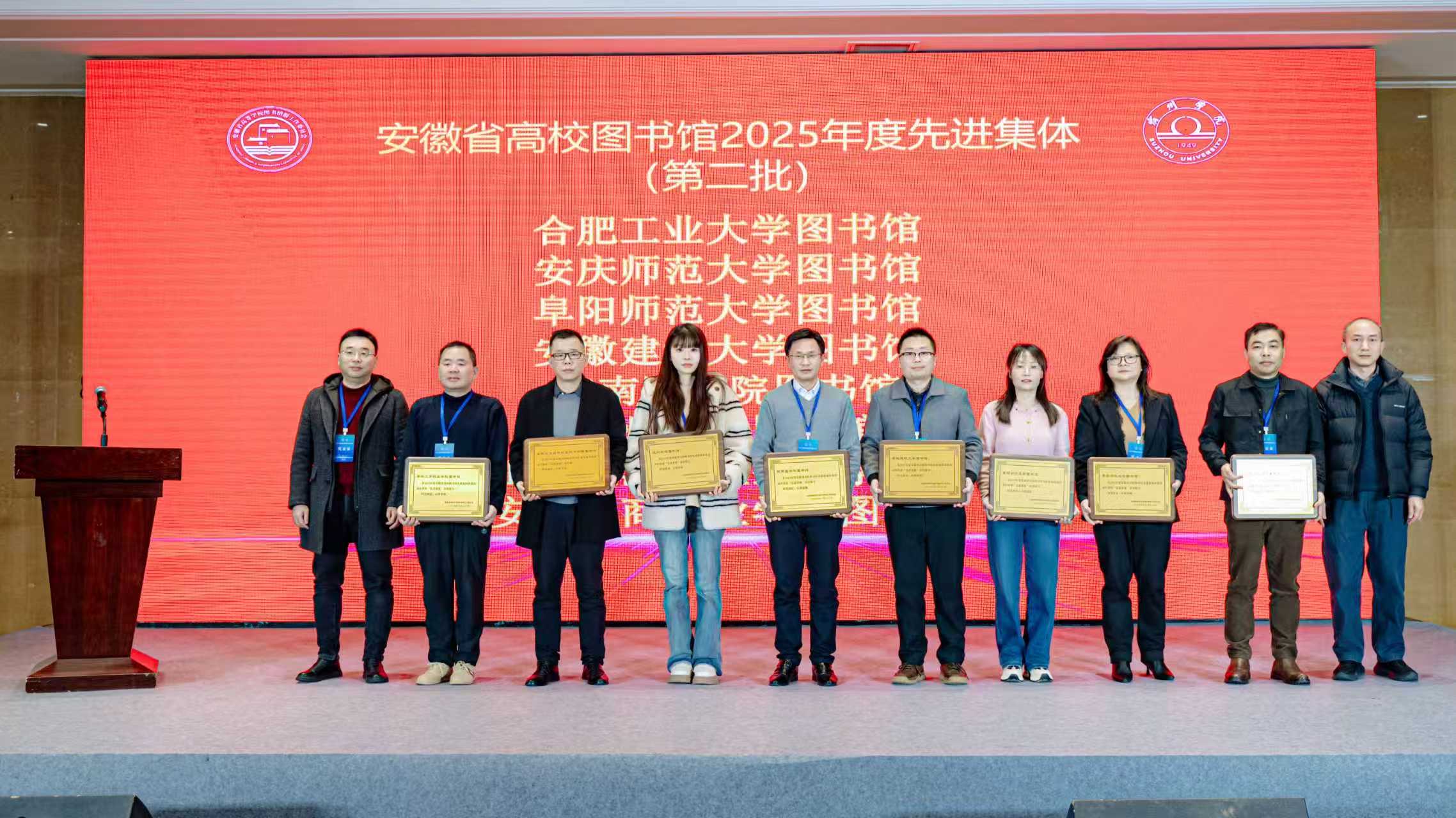 会议表彰了安徽省高校图书馆2025年度先进个人和先进集体。图书馆作为“安徽省高校图书馆2025年度先进集体”接受颁奖,图书馆副馆长刘传迅荣获“优秀馆长”荣誉称号,唐莉、胡瑞荣获“先进工作者”荣誉称号。