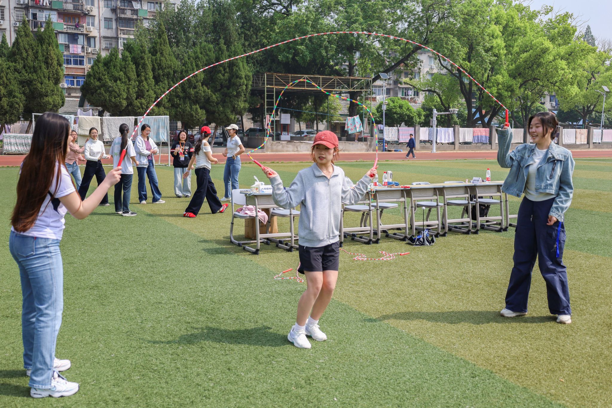 伴着欢快的呼喊,一根近六米的长绳凌空飞旋,“啪嗒啪嗒”的声响清脆有力。绳影交错翻飞间,欢声笑语此起彼伏,学生们身姿轻盈,在绳落的瞬间灵活穿梭,默契完成集体跳绳,热烈的氛围充盈着整个校园。