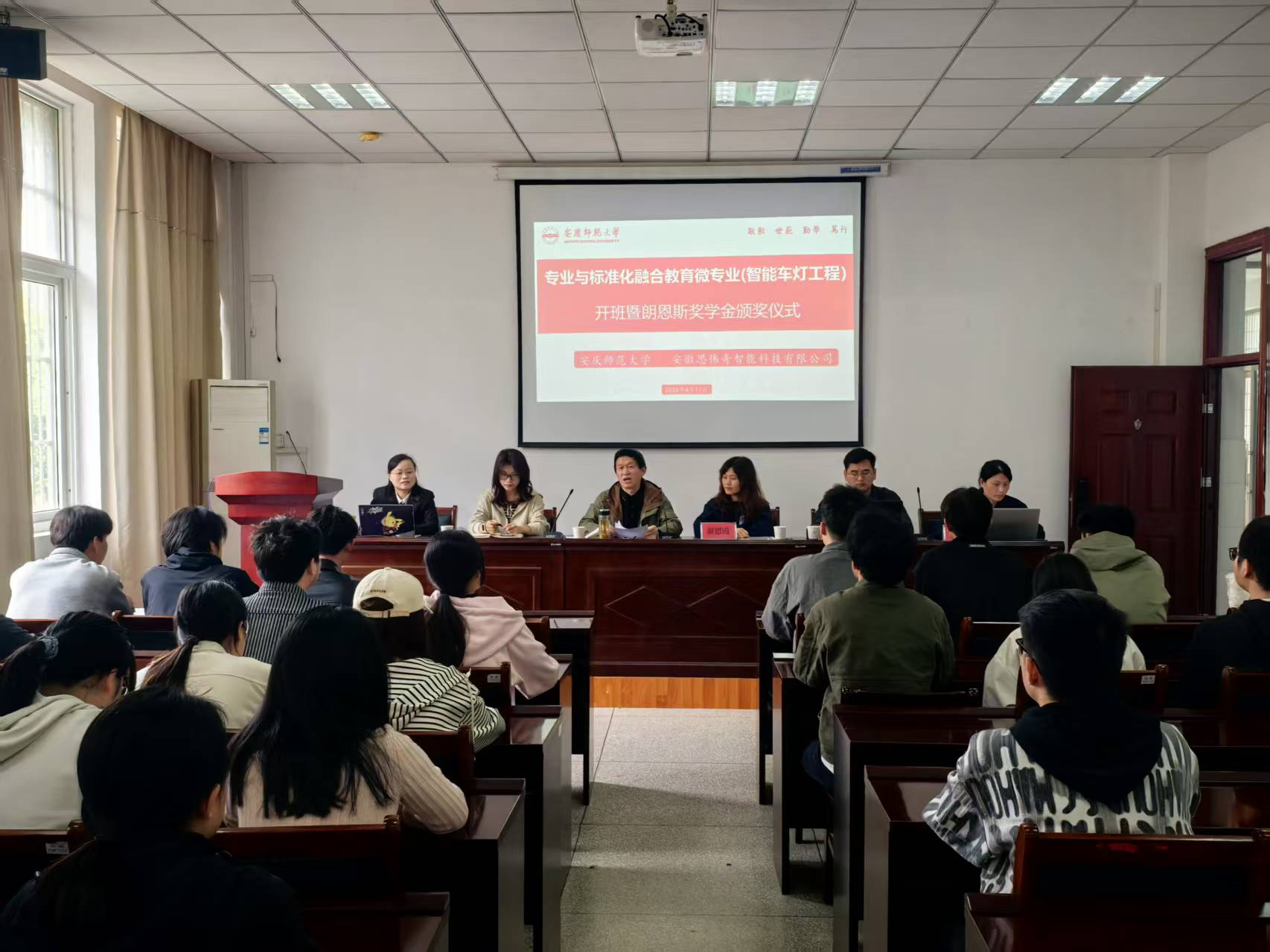 4月17日,学校联合安徽思伟奇智能科技有限公司举办的专业与标准融合教育微专业(智能车灯工程)开班暨朗恩斯奖学金颁奖仪式在稼先楼南104会议室举行。安徽思伟奇智能科技有限公司人事经理谢思霞一行,微专业师生以及奖学金获奖代表出席,仪式由学院副院长詹文法主持。