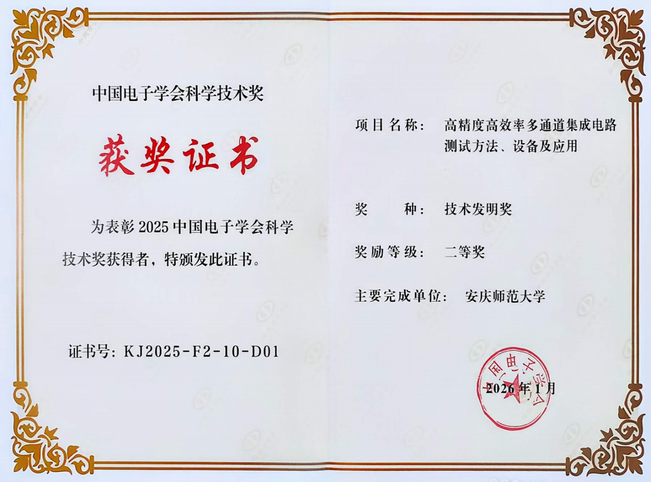 4月19日,中国电子学会正式公布了2025年度中国电子学会科学技术奖评审结果。我院詹文法教授牵头,联合悦芯科技股份有限公司、复旦大学、中国电子科技集团公司第五十八研究所共同完成的“高精度高效率多通道集成电路测试方法、设备及应用”项目,荣获技术发明二等奖。这是威尼斯官网在集成电路测试技术领域取得的又一标志性成果。