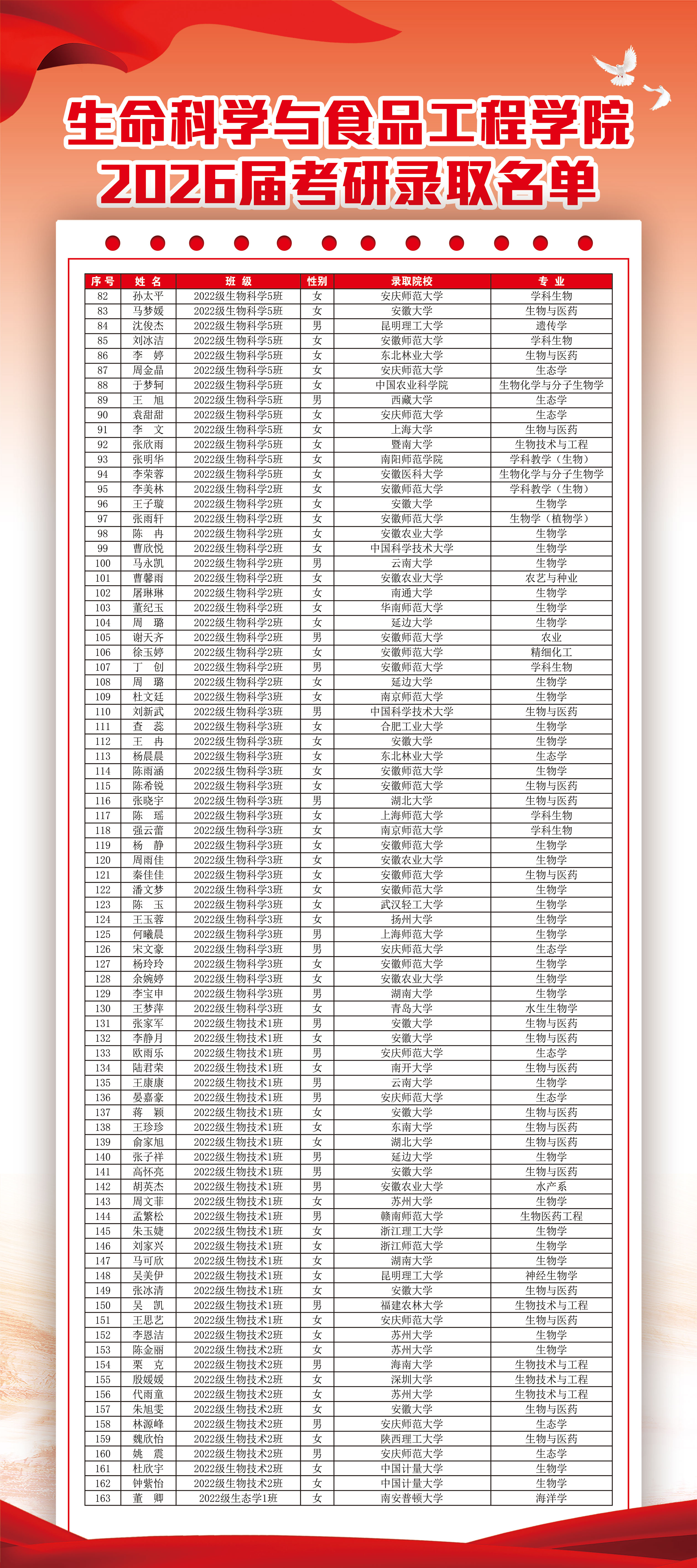 近日,2026年全国硕士研究生招生录取工作顺利落幕,生命科学与食品工程学院再传捷报。2026届本科毕业生392人,升学163人,在报考率比去年降低20%的情况下,达线率43.9%,考研录取率达41.6%,再创历史新高,用亮眼成绩彰显了学院人才培养的扎实成效。