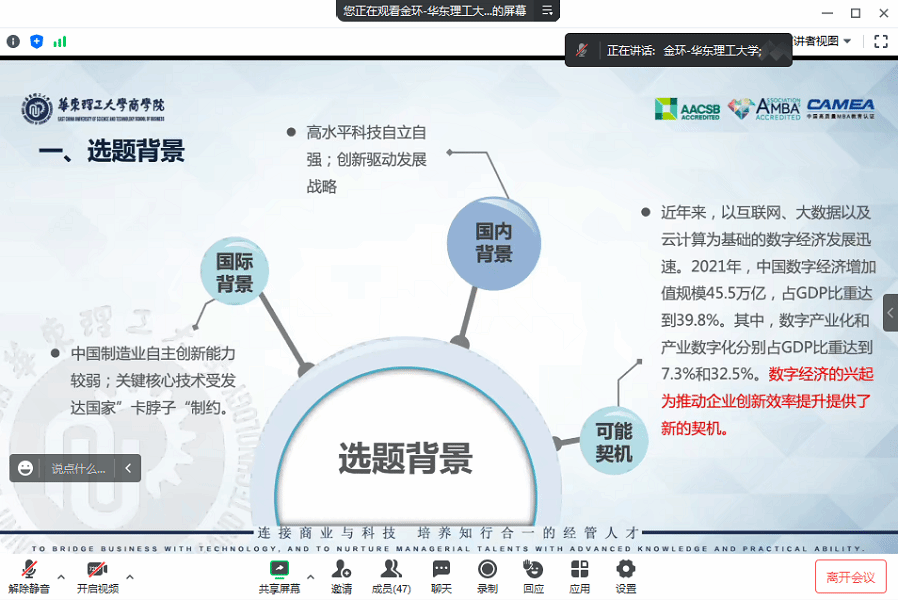 6月5日,由经济与管理学院主办、区域经济与城乡发展研究所承办的研究生学术交流平台“优博讲坛”第10期顺利开讲,本期活动主讲人为华东理工大学金环博士,他通过线上形式作“数字经济、要素市场化与企业创新效率”学术报告,全体统计学研究生、本科生及部分老师参加,报告会由经济与管理学院丁玉龙副教授主持。