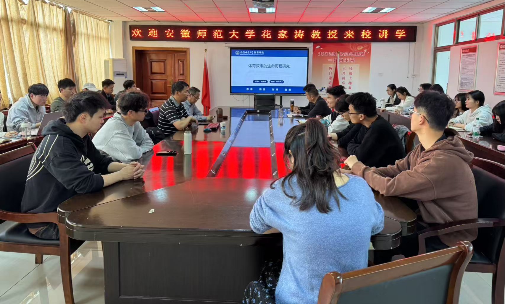 4月7日,安徽师范大学体育学院博士生导师花家涛教授,在体育馆三楼会议室,作了一场题为《体育叙事的生命历程研究》的学术报告。报告会由体育学院副院长孙明运教授主持,教师代表、全体硕士研究生聆听了此次报告。