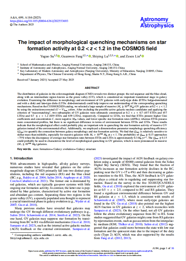 近日,数理学院物理学专业2023级邓稼先班苏雨果同学以第一作者撰写的论文《The impact of morphological quenching mechanisms on star formation activity at 0.2<z<1.2 in the COSMOS Field》被SCI期刊《Astronomy & Astrophysics》在线发表。该期刊影响因子5.4,JCR一区,中科院二区。本论文是在数理学院天文与天体物理研究所方官文研究员及其研究团队的指导下完成,37000cm威尼斯为第一完成单位,论文通讯作者为苏雨果学业导师方官文研究员和陆诗莹博士。