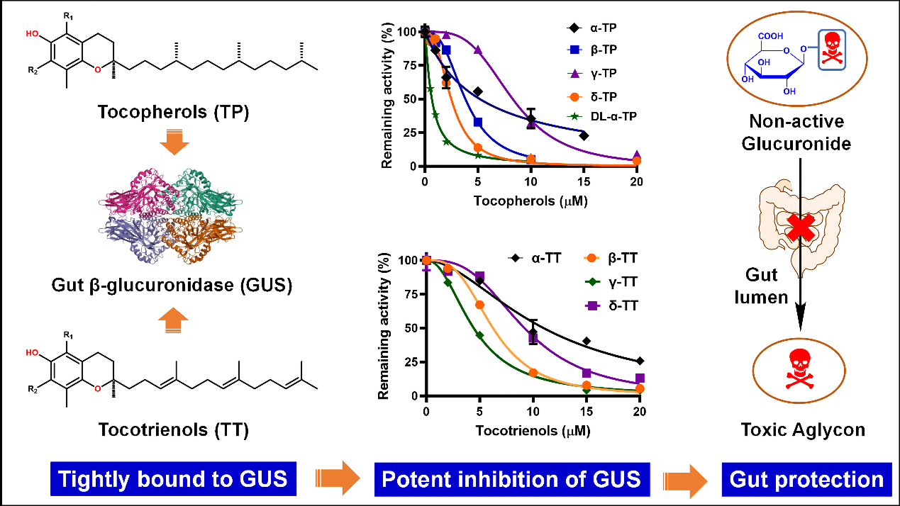 该研究首次发现肠道β-葡萄糖醛酸糖苷酶(GUS)是维生素E的一个新作用靶点。GUS由肠道菌群分泌,能够水解β-葡萄糖醛酸苷类化合物,增加有毒苷元在肠道中的暴露水平,引发肠道毒副作用。维生素E作为食品中广泛存在的高效抗氧化剂,其安全性已得到充分验证。研究表明,保护肠道免受GUS介导的毒性影响可能是维生素E的一项潜在新功能,这为开发靶向GUS的肠道毒性防护策略提供了创新性思路。