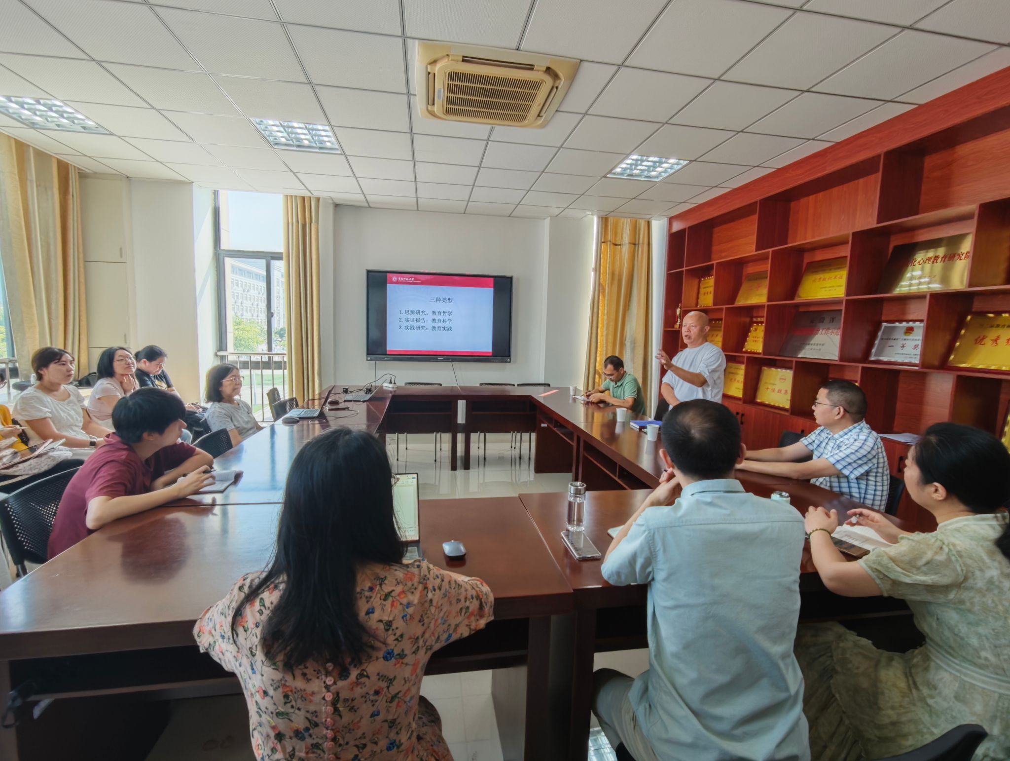 刘教授深入剖析了教育研究的三种类型,包括思辨研究、实证报告和实践研究,并指出三类研究在方法论上的差异与联系。他进一步阐述了教育哲学的视角,强调其通过分类、对立与统一的方式揭示教育现象的本质,并举例说明了“自然教育”“大五人格”“要求-回应关系”等视角在教育实证研究中的应用。刘教授还详细讲解了实证研究的语步结构,包括研究背景、研究设计、研究结果与讨论,以及如何撰写具有说服力的咨政报告。他强调教育研究应避免“本质、价值、对策”三大禁忌,注重“零修辞、陈言务去”的写作规范,倡导史论结合的研究路径。陈效飞副院长总结发言,此次报告会内容丰富,涵盖教育哲学思辨、实证研究方法、教育实践应用等多个层面,为推进教育学科研究的深化与创新提供了重要启发。(撰稿/摄影:程锦 审核:陈效飞)