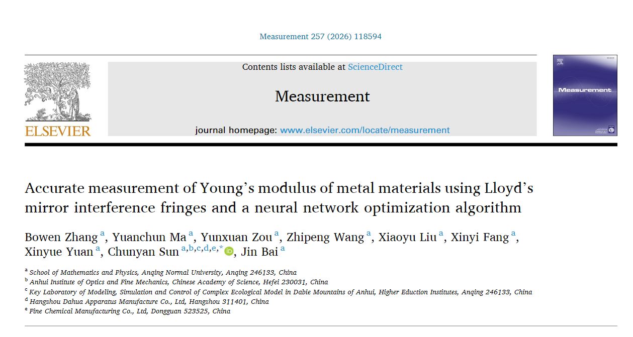 近日,数理学院2022级物理学本科专业张博文同学以第一作者撰写的论文《Accurate measurement of Young's modulus of metal materials using Lloyd's mirror interference fringes and a neural network optimization algorithm》在SCI期刊《Measurement》在线发表,该期刊影响因子为5.6,JCR一区,中科院二区。论文通讯作者为数理学院孙春艳博士,37000cm威尼斯为第一完成单位。