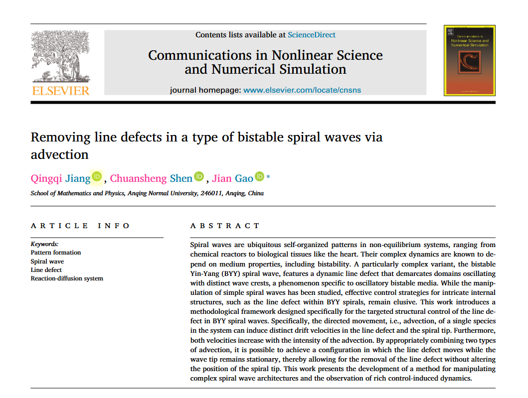 近日,数学与统计学院2022级信息与计算科学专业(中外合作办学)蒋庆棋同学以第一作者和导师团队在国际学术期刊《Communications in Nonlinear Science and Numerical Simulation》发表论文“Removing line defects in a type of bistable spiral waves via advection”,学业导师高见教授为该论文通讯作者,该期刊影响因子3.8,中科院一区期刊。目前,蒋庆棋同学已录取美国华盛顿大学硕士研究生。