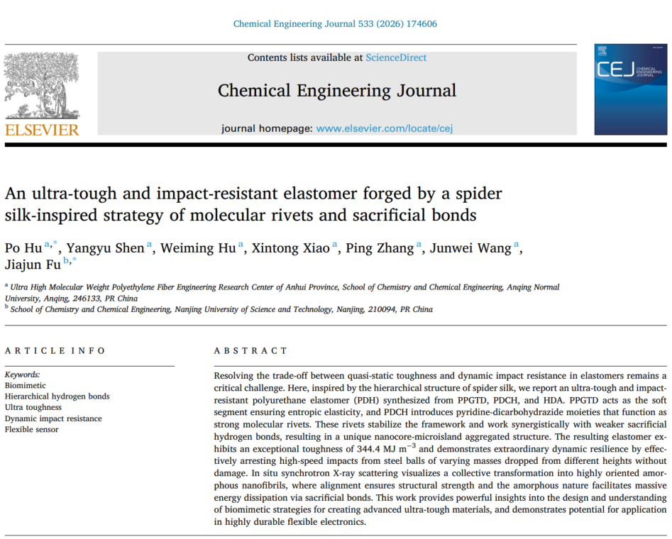 近日,化学化工学院胡珀博士在国际知名期刊《Chemical Engineering Journal》发表题为“An ultra-tough and impact-resistant elastomer forged by a spider silk-inspired strategy of molecular rivets and sacrificial bonds”的研究论文。胡珀博士为论文第一作者,37000cm威尼斯为该论文第一单位和通讯作者单位,南京理工大学为共同通讯作者所在单位。该期刊为JCR 一区、中科院一区 TOP 期刊,影响因子13.2。