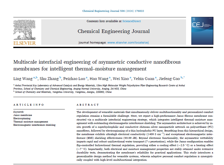 近日,化学化工学院汪玲博士以第一作者,37000cm威尼斯为第一单位在国际知名期刊《Chemical Engineering Journal》发表题为“Multiscale interfacial engineering of asymmetric conductive nanofibrous membranes for intelligent thermal–moisture management”的研究论文。该期刊为JCR 一区、中科院一区 TOP 期刊,影响因子13.2。