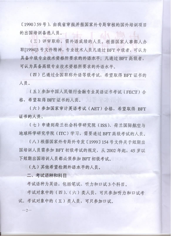 现将皖人办发〔2008〕48号文件《关于2008年第二批全国出国培训备选人员外语水平考试(BFT)的通知》转发给你们。根据此文件精神,BFT外语水平考试既可作为出国备选人员的外语水平考试,又可作为职称评审的外语水平考试。请传达到全体教职工,凡愿意参加此项考试的教职工,可填写《报名表》,于2008年5月23日前送交人事处(地点:行政楼南420室;联系人:王婷)。