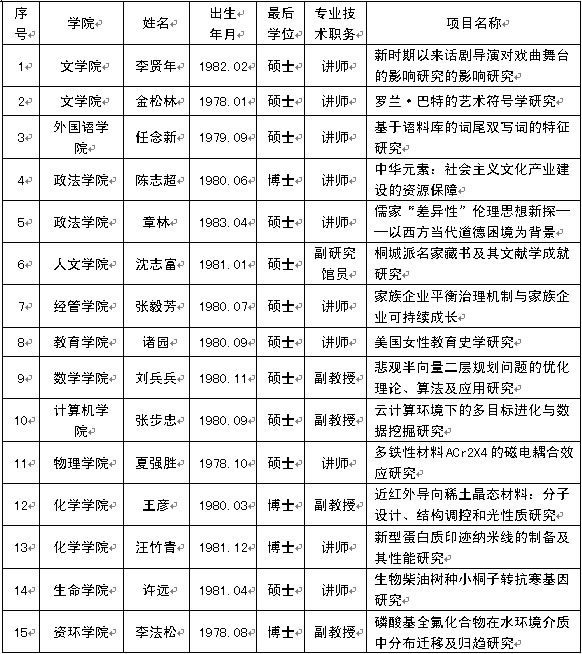 经专家组评审,拟向教育厅推荐下列15项课题申报2013年安徽省高校省级优秀青年人才基金重点项目,现予以公示。