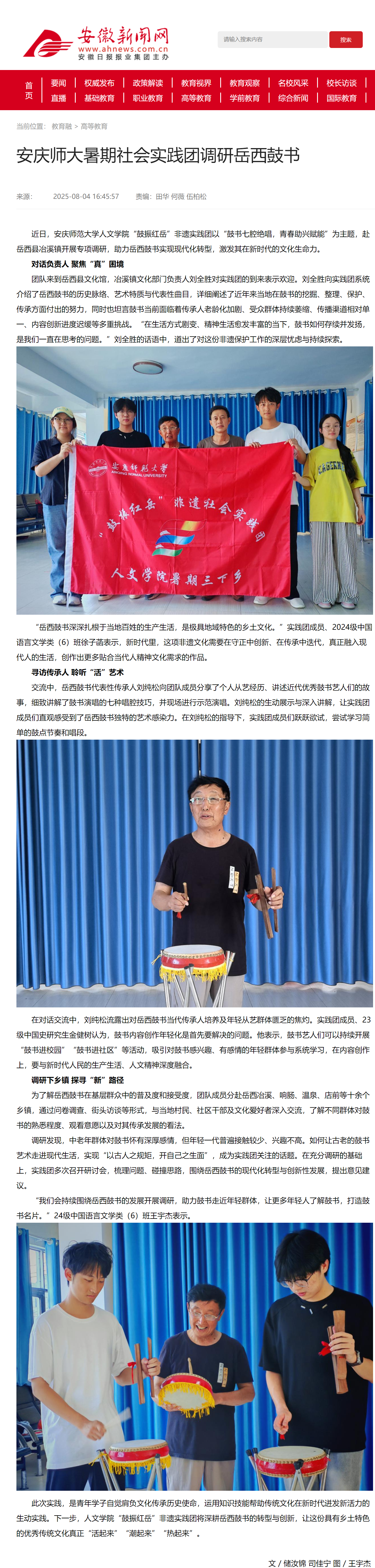 上一篇:安徽新闻网:探寻当代传承路径 安庆师大学子开展黄梅戏生态调研