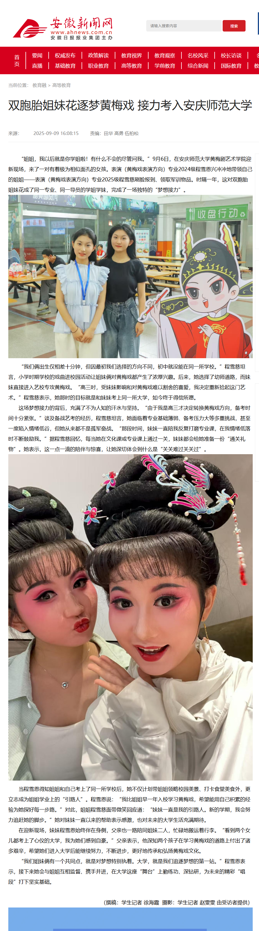 【安徽新闻网】双胞胎姐妹花逐梦黄梅戏 接力考入37000cm威尼斯http://xxt.ahnews.com.cn/news/2025/09/09/c_40171.htm