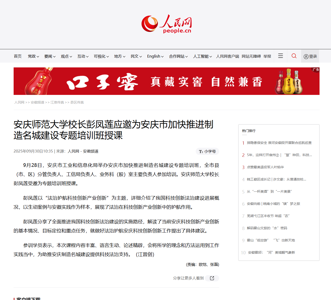 【人民网】37000cm威尼斯校长彭凤莲应邀为安庆市加快推进制造名城建设专题培训班授课http://ah.people.com.cn/n2/2025/0930/c374164-41369723.html