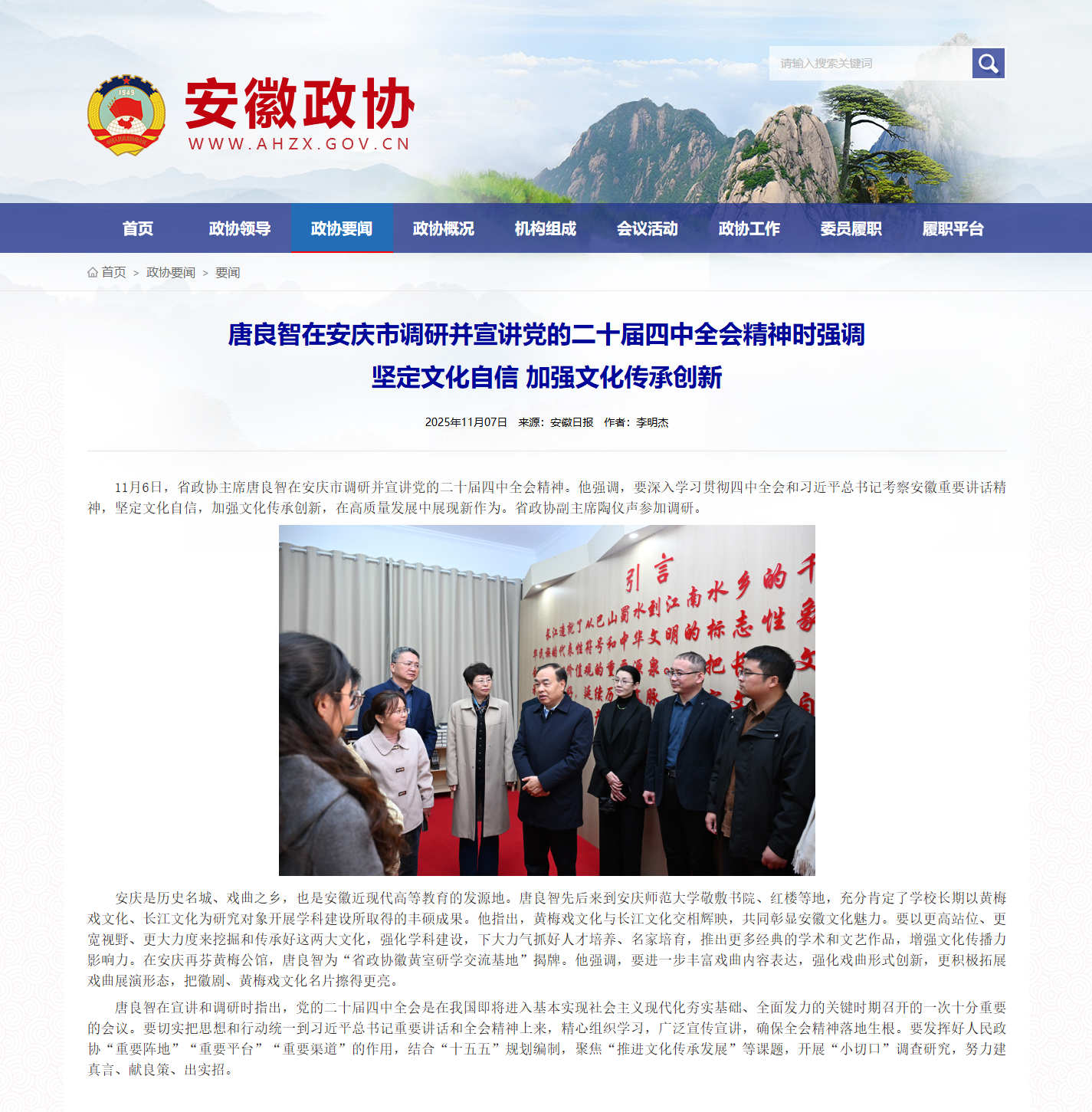 安徽政协:唐良智在安庆市调研并宣讲党的二十届四中全会精神时强调 坚定文化自信 加强文化传承创新http://www.ahzx.gov.cn/detail?id=44a6e22f4d684fc59be379fd629d0d4d