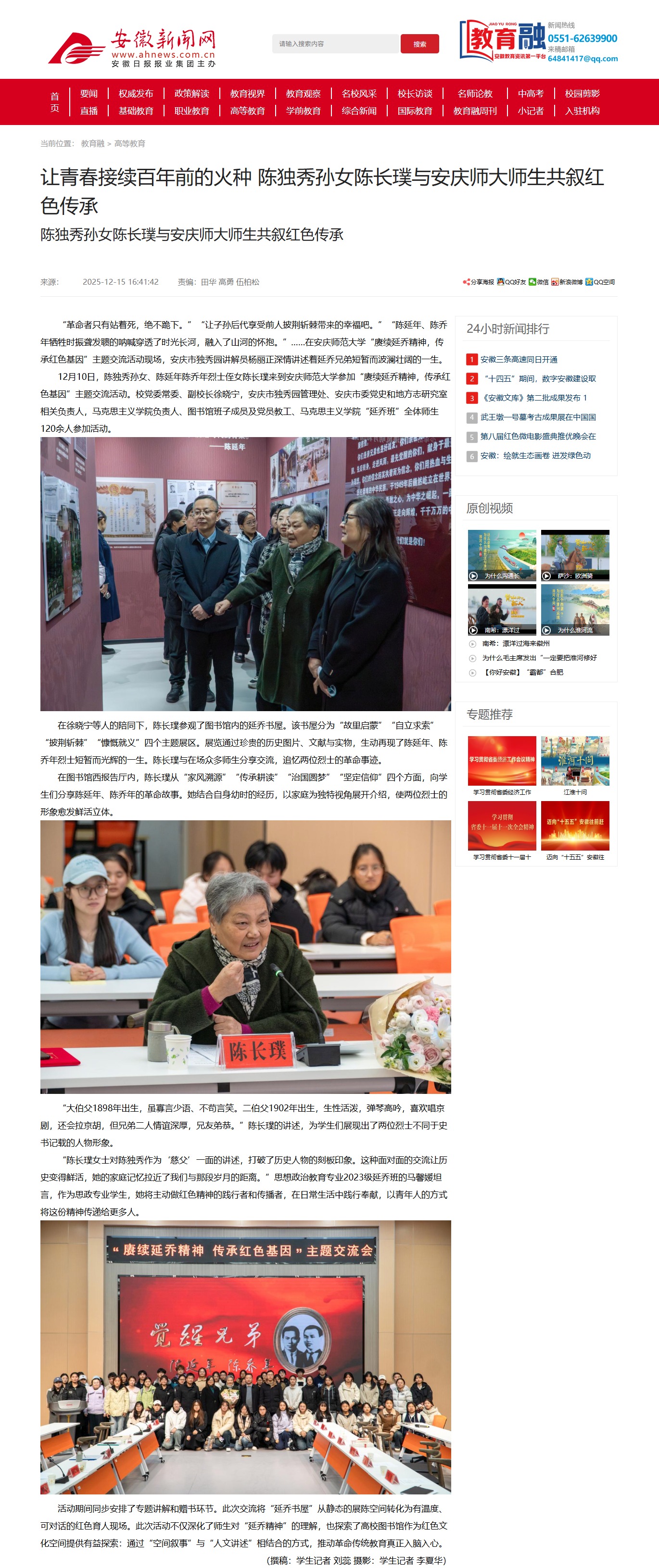 【安徽新闻网】让青春接续百年前的火种 陈独秀孙女陈长璞与安庆师大师生共叙红色传承 陈独秀孙女陈长璞与安庆师大师生共叙红色传承http://xxt.ahnews.com.cn/news/2025/12/15/c_43501.htm